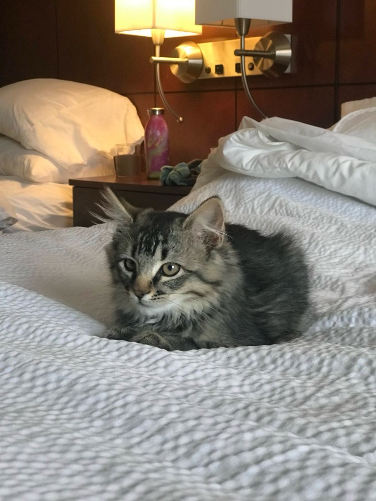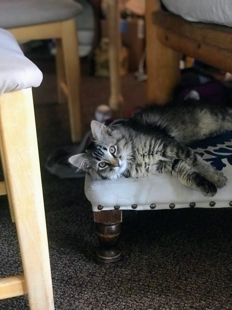 in the muddy outside world Deets could not find a place to dookie. she was whining all about it, but I didn’t know how to help. an indoor cat box just doesn’t do it for this kitten. I followed her around outside and enjoyed the walk while she complained. there’s simply nowhere to dig! after a half hour, Deets finally found a dry spot underneath a copse of stalks of tree like a giant bush. these not-quite tree trunks in a bunch set a foot-ish apart from each other sometimes more and each of them has 1 million little not-branches coming off of it. a soda can circumference covered in little twiggy sticks, all of it dry and brittle. Deets does her dookie and covers the hole then immediately, before I can react at all, scampers up one of those lame trunks, leash catching all the way up behind her like reverse plinko. the leash is immediately enmeshed in all these little twigs, the fated tangle behind and above Deets so when she finally gets stuck, she just dangles there. at the top of the tree. more than ten feet up. no one is happy about this.