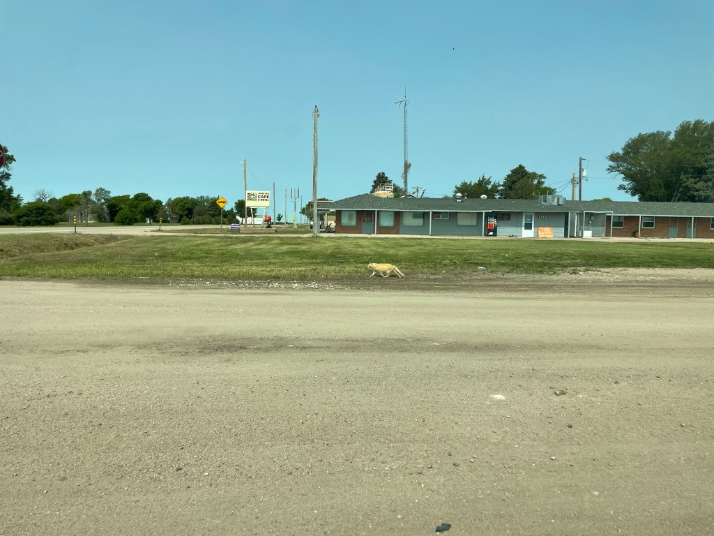 11.5 hours on the road is the longest I’ve ever done as sole driver. Idalia was a bit out of the way, for a sweet and secret reason. We saw the mayor crossing the main drag, pictured above. Deets and I managed to get in some roadside walks before we left the rural wilderness, and gratefully. Then from the road we saw buffalo! Kansas was mostly windmills and Jesus. Spring looks real good on Missouri and the river is an absolute stunner. If there’s a line for the rest stop bathroom, you can pee in the pet area. Somewhere today we crossed into central time. Expressways are tough. Sleeping will be easy.
