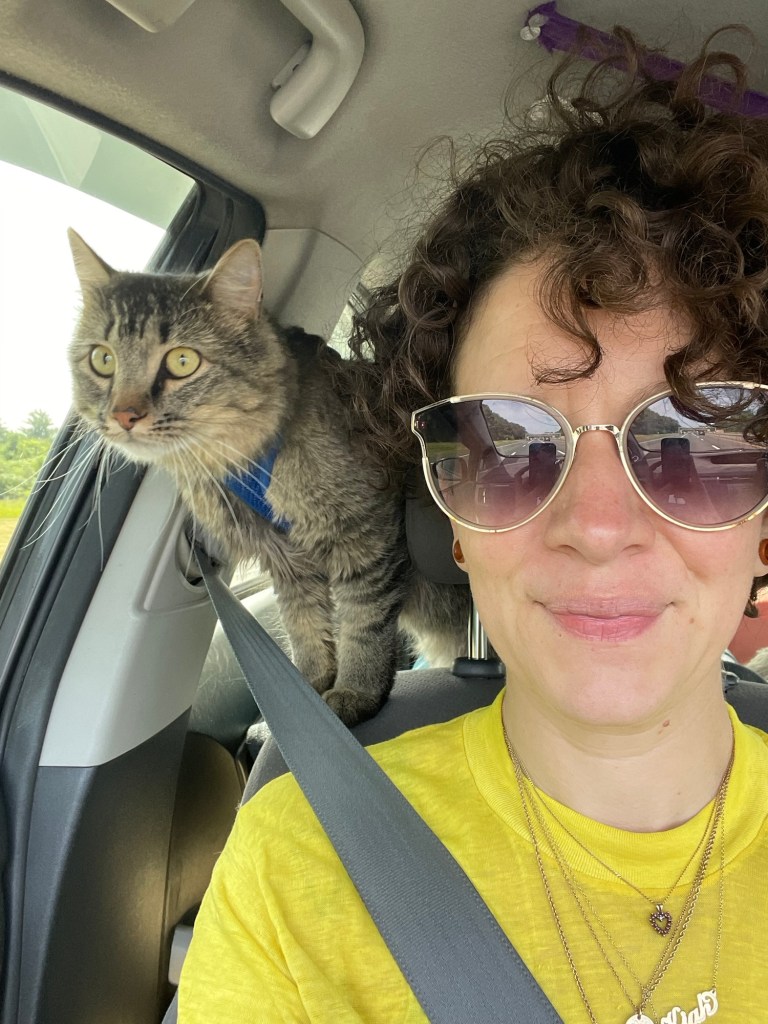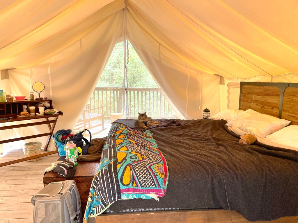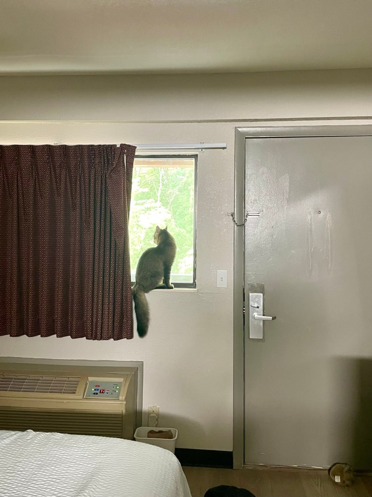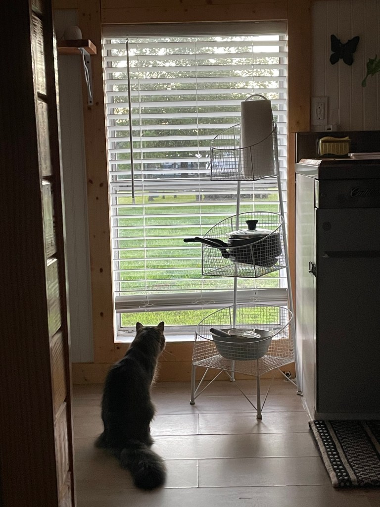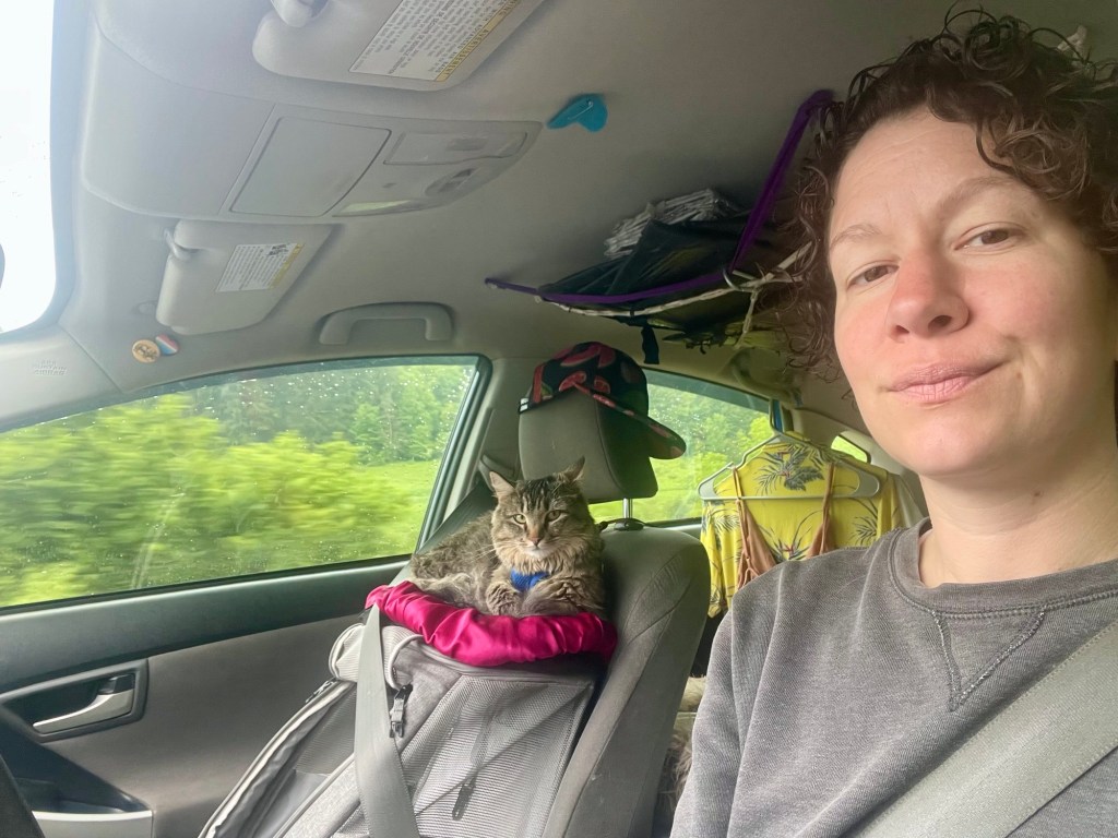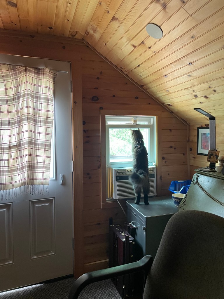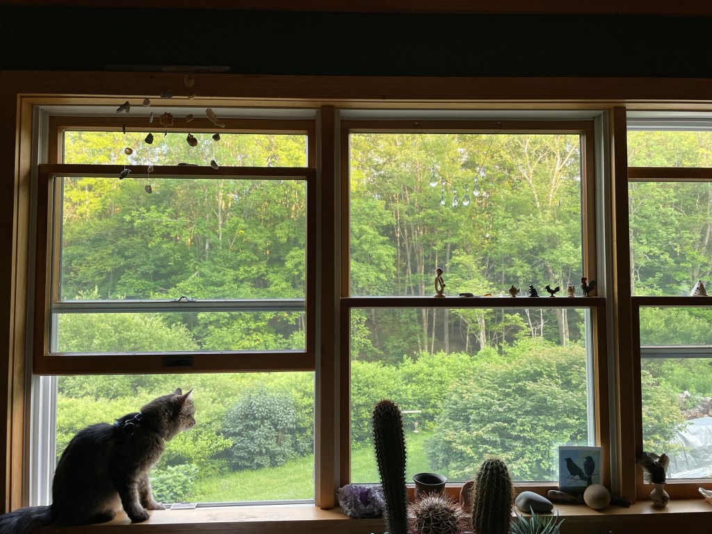 in 2017, following a trip through Southeast Asia I was in my hometown again. it was the best part of the year and the best event to celebrate: The Great Blue Heron Music Festival on July 4th weekend. I leaned back in a campsite chair by the fire and marveled at the comparatively small bunches of leaves throughout the layered and sundry greens of temperate forest canopy. I had been in the tropics for months amidst towering jungle trees with leaves the size of my own trunk (torso, not rear). under similarly reaching stalks in an equally dense forest I was newly struck by the quality of daylight through translucent and quivering swatches of greens. recently I have been living in the high desert among junipers and scrub oak and prey animals. I haven’t been to my hometown in years, much less again at a glorious summer high. my current home in aridity has trees I can climb and lots of rocks. the greens of my youth are viciously vibrant, as with the blues; I have genuinely had to readjust. the trees with the little leaves these days loom like monsters so impressively tall. Deets is in joyful, playful confusion. she spent much of today watching chipmunks, and tonight we’ll sleep in a tent. throughout this trip I have been repeatedly overcome by awe at Deets’ adaptability, amid car rides, new spaces, strange sounds and new faces, fresh smells and wet grasses, trees with unclimbable trunks and no tops… what can’t this kitty do?!?