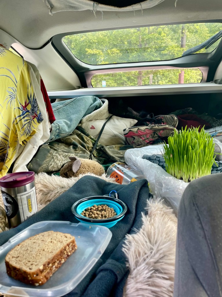 (Platform picnic since I no longer sleep in here. Max has this car’s back seats in his garage in Maine, which I reluctantly intend to retrieve.)