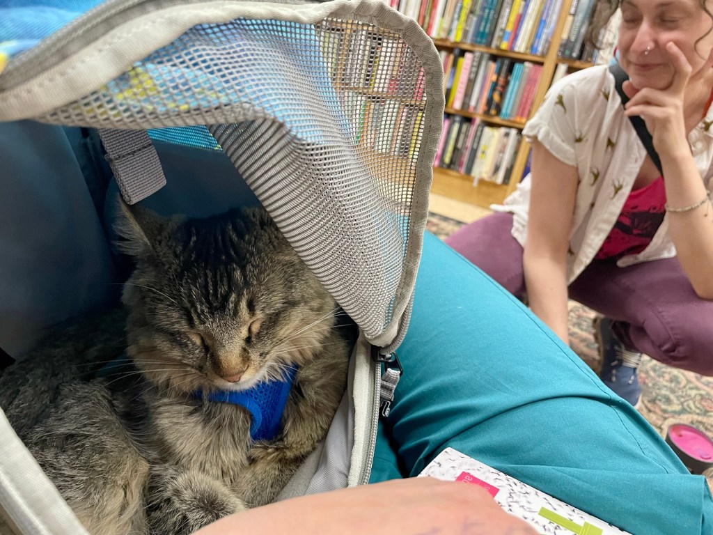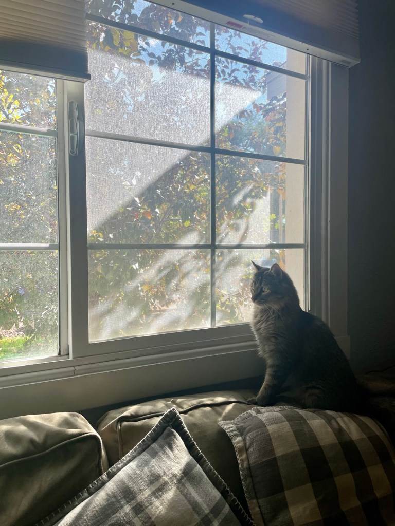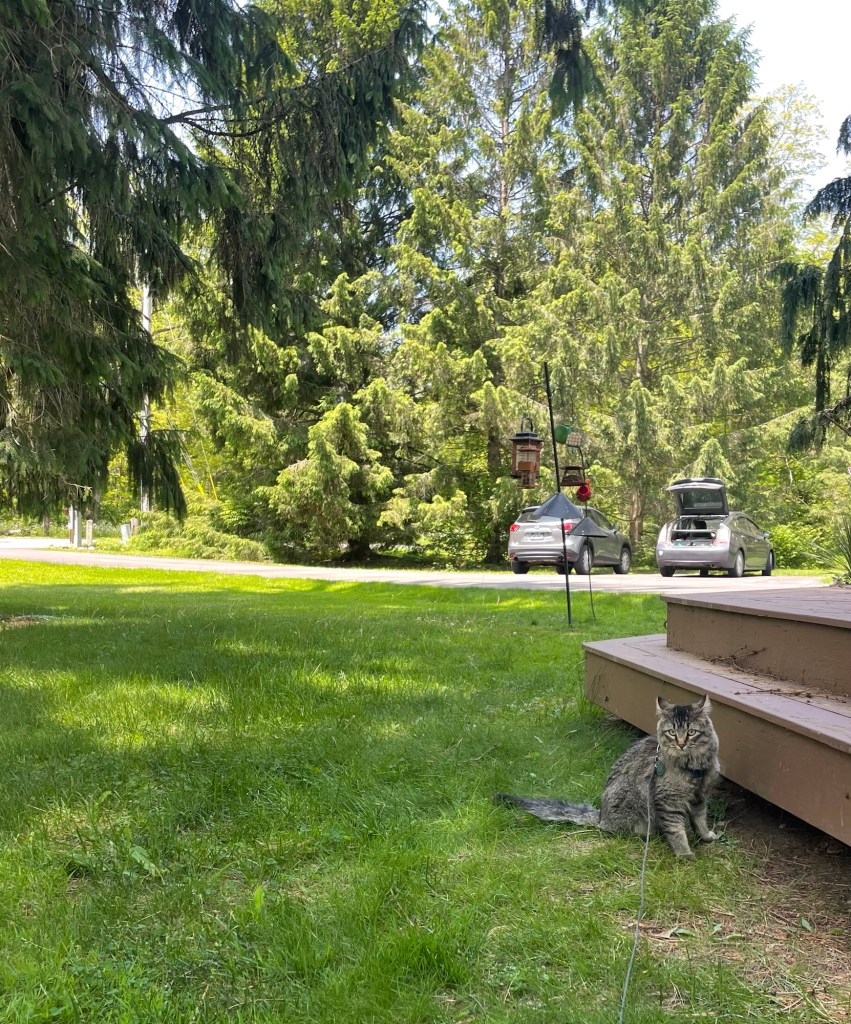 the leash is still tangled and I still can’t reach high enough to fix that. I need my free hand to climb. Deets needs that hand to hold her. all the while my feet are in my favorite hiking shoes, slowly crushing more twigs as the trees resist my plan. I resettle my weight, bracing. this is trickier than I’d hoped. now it’s about not panicking: I’m realizing that if I go down, I’ll hit so many different sticks. it will be a very slow descent and mostly just hurt my clothes and maybe my hands and face. I am now aware that it’s possible I wouldn’t be injured at all. okay. reset, look around, shimmy as I explain to the barely-supported cat that I’ve gotta use my hand. I tug as much slack as I can from the intertwisted leash and kinda just.. let Deets go.