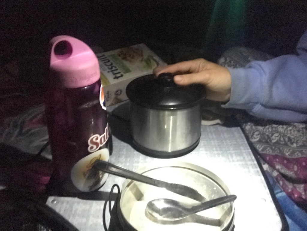 Camping on the road and doing dishes is annoying. i only use a few but it takes water, and usually either soap or effort or both, to clean them. i’ve gotten into the habit of collecting water. i fill my drinking water from the machines outside stores, reusing bottles as long as i can stand them. Other water i am happy to gather anywhere, and lately—at the same thrift store but less on purpose—i found the perfect water spout thing. It slides into my trunk next to the bed and is stabilized by the same bungee that holds my bookshelf. Next to this 1.75l blessing is a box containing a dish sponge, homemade liquid soaps—one for skin and one for everything, towels, and ironically, baby wipes. To use my little sink i open the hatchback and unhook the bungee from the cargo position into a more useful attachment, allowing the spout to stretch out from the rear of the vehicle for use. It’s a really good way to do daily dishes, and i mostly don’t take them all into truck stops anymore.
